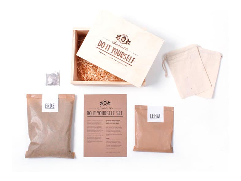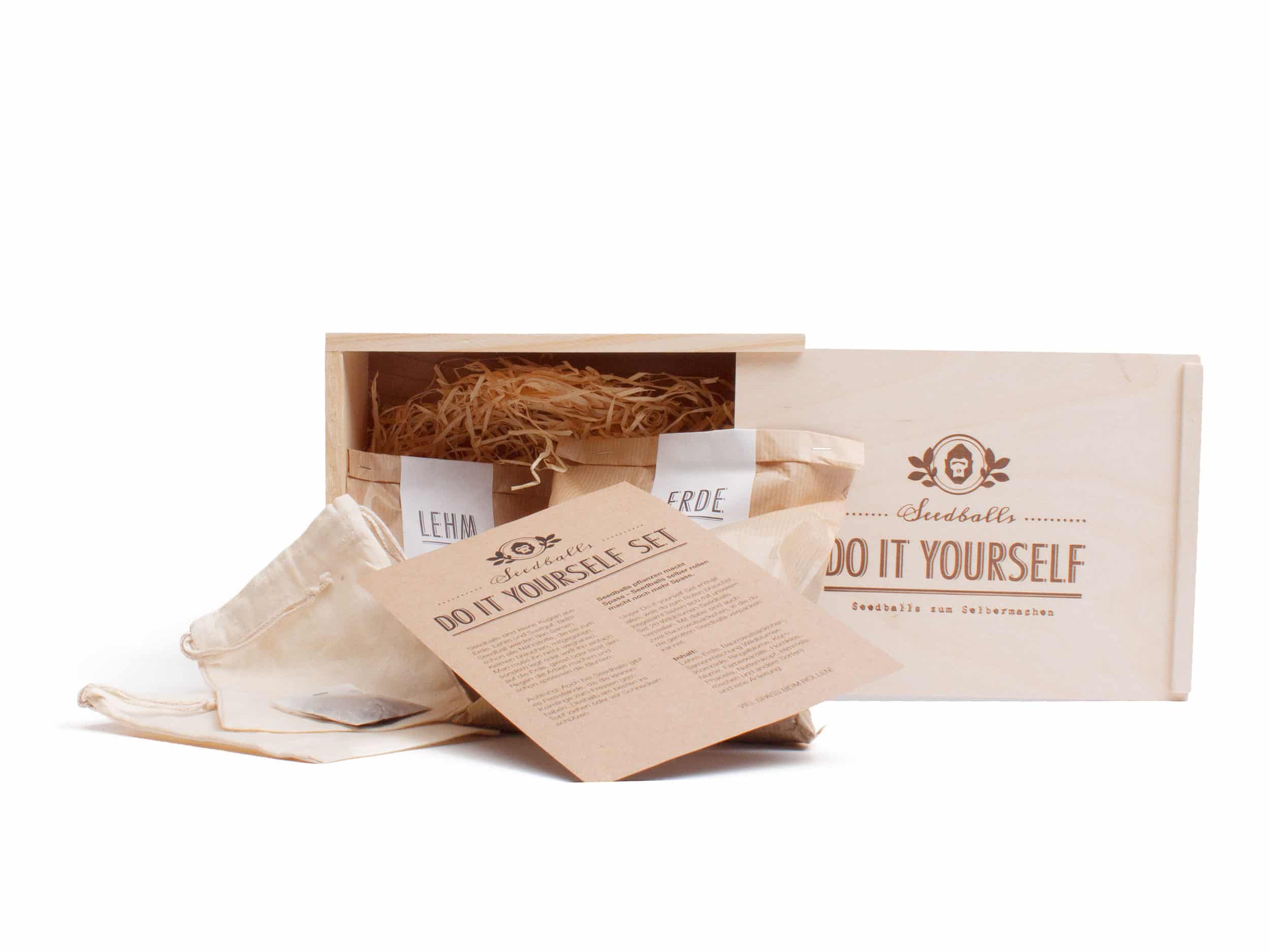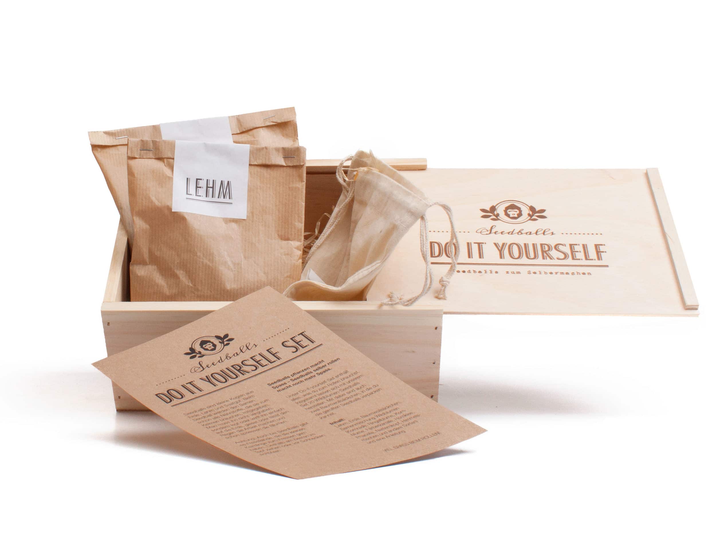 Das Seedballs «Do it yourself»-Set ist da. In der gebrandeten Holzbox von ist alles enthalten, was Du brauchst um Deine Seedballs selber zu rollen. Das schöne Set enthält Erde, Lehm, Wildblumen-Samen, zwei Baumwollsäckchen sowie eine Anleitung. Mit dem Set lassen sich ca. 20 Seedballs rollen.
